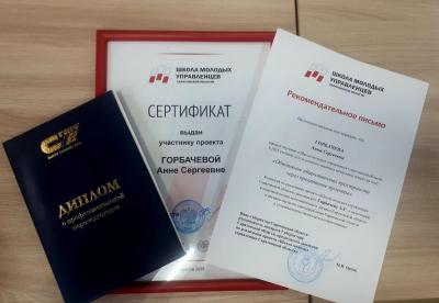 На церемонии закрытия восьмого потока «Школы молодых управленцев» губернатор Саратовской области Р.В. Бусаргин вручил Горбачевой А.С. диплом о профессиональной переподготовке и сертификат участника. Также Анна Сергеевна удостоена рекомендательного письма к включению в кадровый резерв исполнительных органов Саратовской области и органов местного самоуправления Саратовской области в установленном законодательством порядке.