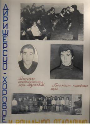 Дирижерско-хоровое и вокальное отделение состояло из двух классов: класса хорового пения и класса сольного пения. Концертмейстером хора и вокала работал С. Галин. На занятиях его класса студенты овладевали правильными певческими навыками, музыкальными основами хорового пения, методиками работы с хоровым коллективом, занимались разучиванием музыкальных произведений. В вокальном классе проводились индивидуальные занятия со студентами-вокалистами и занятия с мужским вокальным ансамблем, который готовил целые концертные программы, состоящие из народных песен, а также песен советских и зарубежных композиторов. Преподавала в классе вокала Л.П. Потемкина.