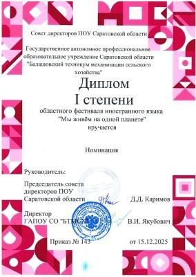 Поздравляем студентку 3 курса специальности «Землеустройство» Лекомцеву Яну, участвовавшую в областном фестивале иностранного языка «Мы живём на одной планете» и занявшую 1 место в направлении «Поэтическое признание»! На фестиваль было представлено стихотворение собственного сочинения на английском языке.