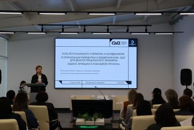 Мероприятие модерировала Лудильщикова Наталья Андреевна, региональный координатор демонстрационных экзаменов. Всего в работе приняли участие 80 представителей из 56 образовательных организаций области. Пугачевский филиал ФГБОУ ВО Вавиловский университет на совещании представила куратор демонстрационных экзаменов Балабекова Альфия Идрисовна. Она выступила с докладом на тему "Разработка оценочных материалов для проведения демонстрационного экзамена: экспертный опыт, реализация, перспективы".
