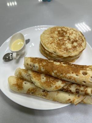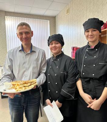 Обучающиеся 2 и 3 курсов специальности 43.02.15 Поварское и кондитерское дело под руководством преподавателя Ширяевой Т.И. выпекают блины и блинчики и угощают студентов и преподавателей колледжа.