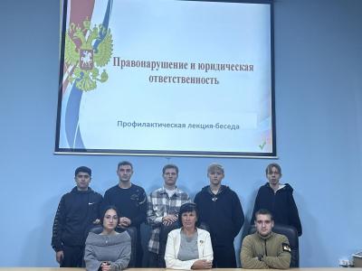 30 сентября для студентов 2 курса ФТК (куратор Чернова Е.Н.) была организована профилактическая лекция-беседа «Правонарушения и юридическая ответственность». Из лекции ребята узнали, что такое правонарушение, как отличаются проступки и преступления, какие виды юридической ответственности могут быть применены к правонарушителям.